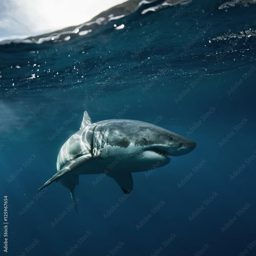 Fototapeta Great White Shark in blue ocean. Underwater photography. Predator hunting near water surface - ryby - Picturewall.pl