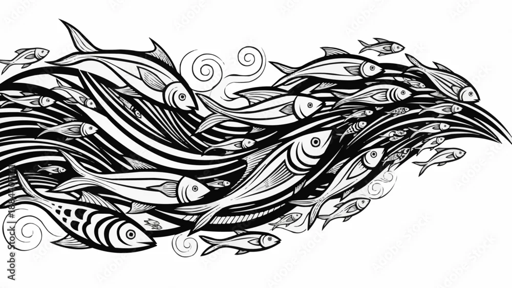 Fototapeta School of fish swimming in stylized ocean waves. - ryby - Picturewall.pl