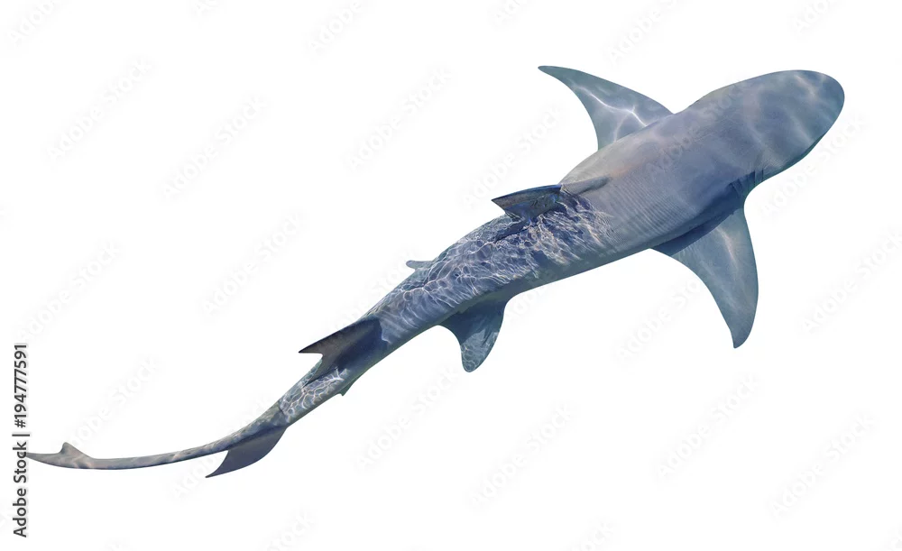 Fototapeta Sicklefin Lemon shark, Negaprion acutidens, samodzielnie na białym tle. Cytrynowy rekin jest piaszczystą rafą w pobliżu brzegu rafy. Skopiuj miejsce Widok z góry.