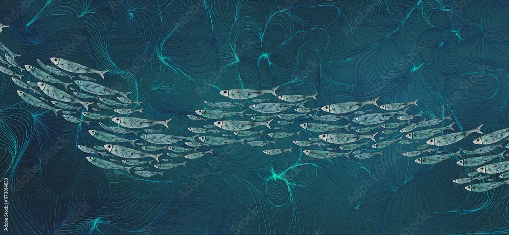 Fototapeta Siluetas de sardinas en el fondo del mar. Banco de peces y mar pintados en tinta y acuarela. Fondo marino. Estilo japonés, ornamental.