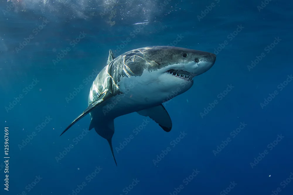 Fototapeta Wielki biały rekin w błękitnym oceanie. Fotografia podwodna. Drapieżnik polujący w pobliżu powierzchni wody.