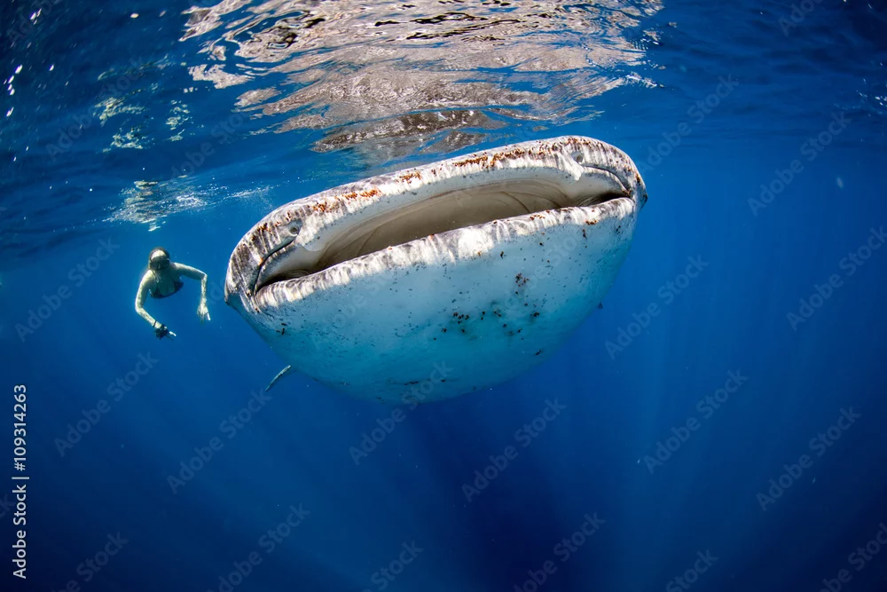 Fototapeta Woman swimming side by side with a huge whale shark in the clear blue ocean.