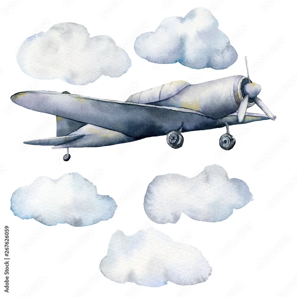 Fototapeta Akwarela z chmury i samolot. Wręcza malującą niebo ilustrację z samolotem odizolowywającym na białym tle. Do projektowania, nadruków, tkanin lub tła.