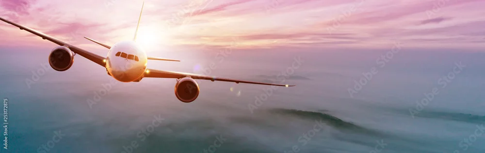 Fototapeta Samolot komercyjny lecący nad dramatyczny zachód słońca