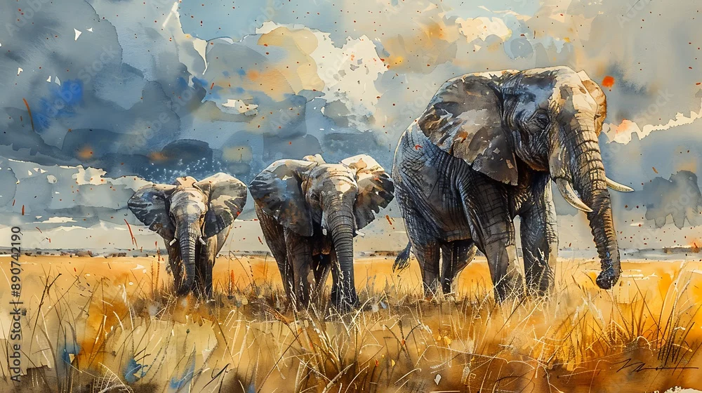 Fototapeta A watercolor painting of an elephant family moving gracefully through a sun-drenched savannah, with wildflowers dotting the landscape and mountains in the distance.