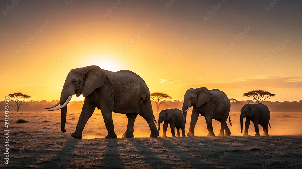 Fototapeta Elephant Family Walks Across a Plains at Golden Hour Sunset