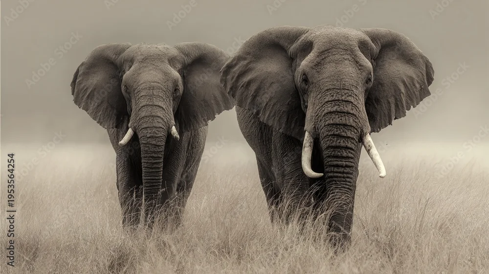 Fototapeta Two African elephants walking together in savannah with tusks and large ears