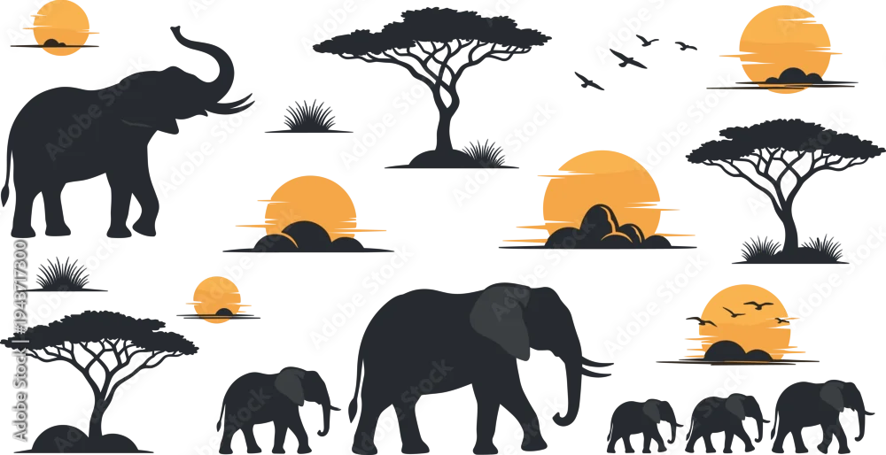 African elephant family silhouettes with acacia trees and sunset landscape vector collection, wildlife safari animals in savanna illustration set