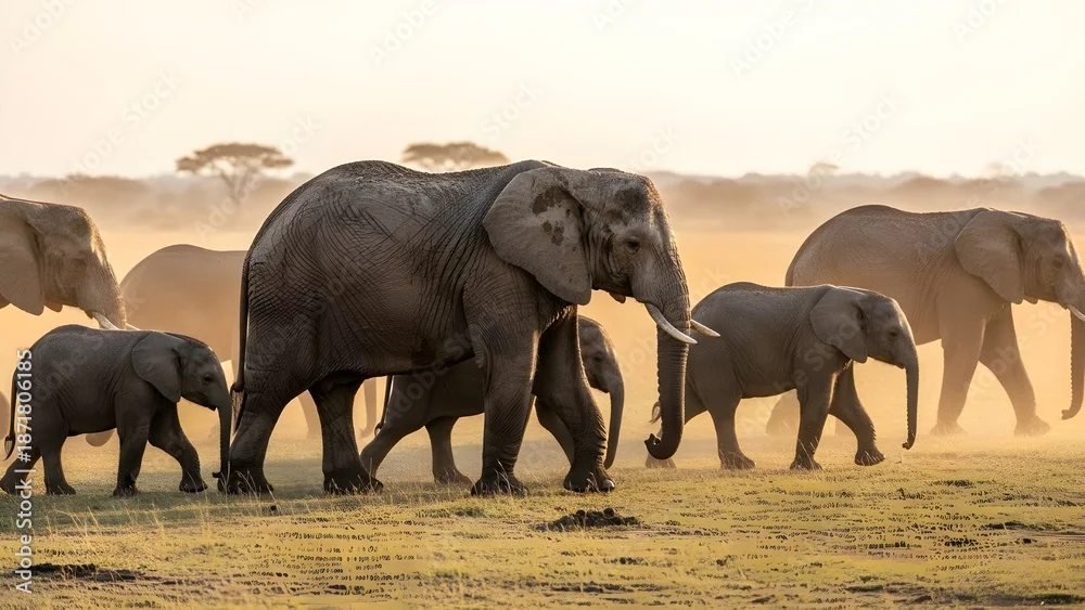 Fototapeta An elephant family moves calmly across a sunlit savanna, with young calves protected by adults.