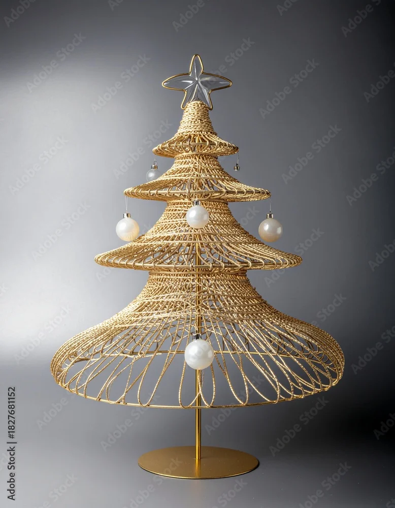 Fototapeta Arbre de Noël contemporain, tissé de fil d'or avec boules de Noël blanches et dorées, isolé sur fond gris. Generated Image.