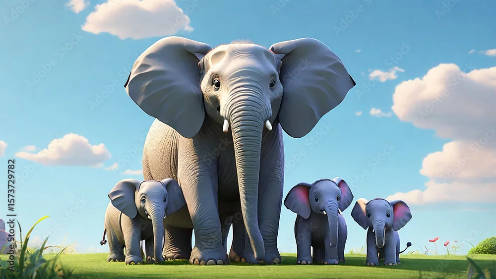 Fototapeta 3D Cartoon Elephant Family Standing on Green Grass