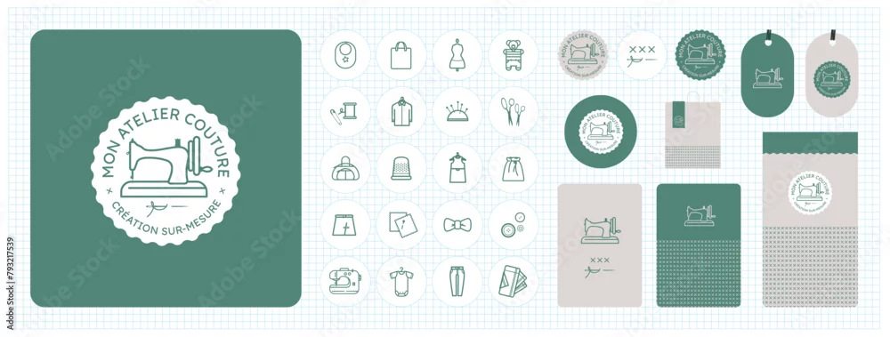 Fototapeta Identité graphique pour couturière, couturier, retouche de vêtements, réparation et vente, marché aux puces de machines à coudre anciennes, atelier de couture, cours de couture, créateur, modéliste,