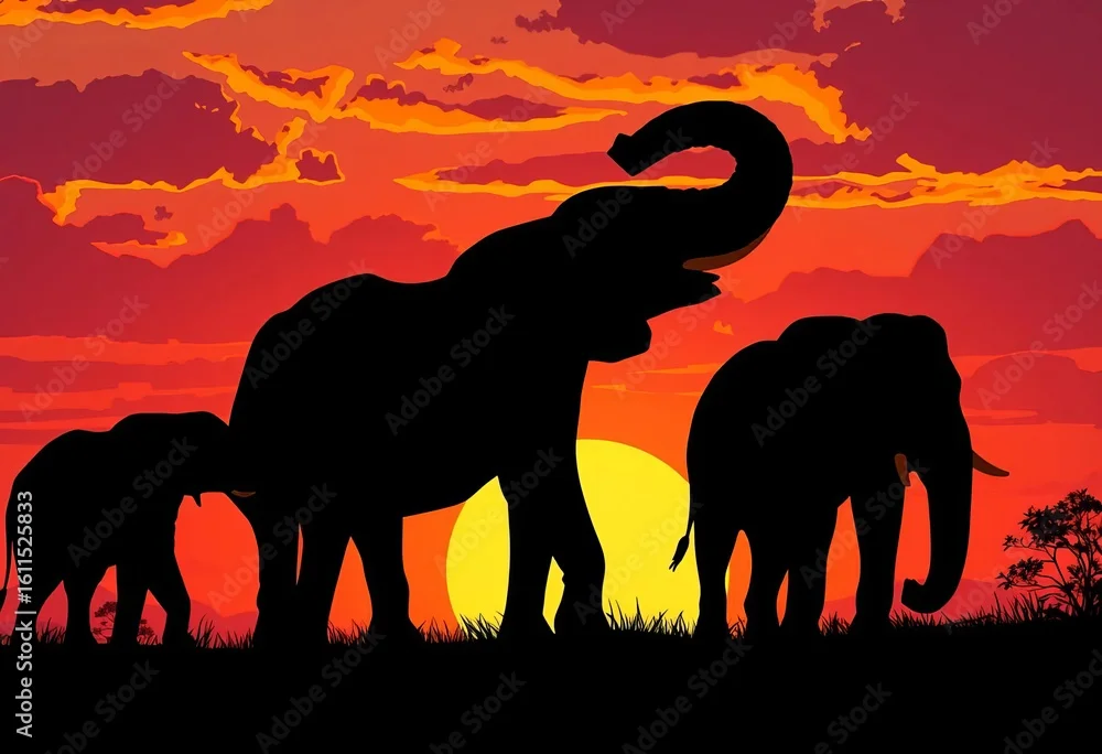 Fototapeta Silhouette of elephant family against vibrant sunset, flat vector illustration, image, vector