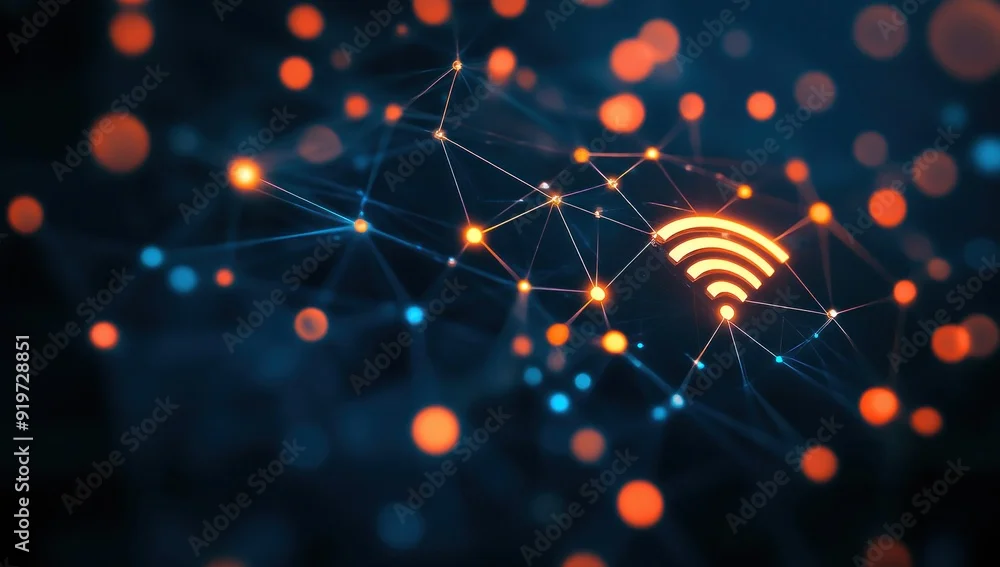 Fototapeta Symbole de réseau Wi-Fi sans fil entouré de connexions lumineuses, représentant la nature interconnectée de la technologie et de la communication.