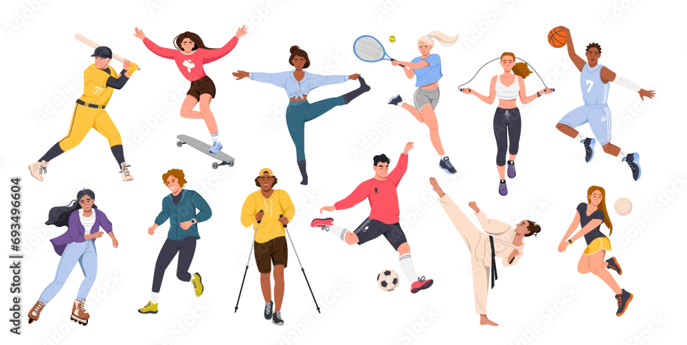 Fototapeta A set with vector characters of athletes. Men and women play sports. Team , game, street sports, martial arts. Vector illustration in the flat style