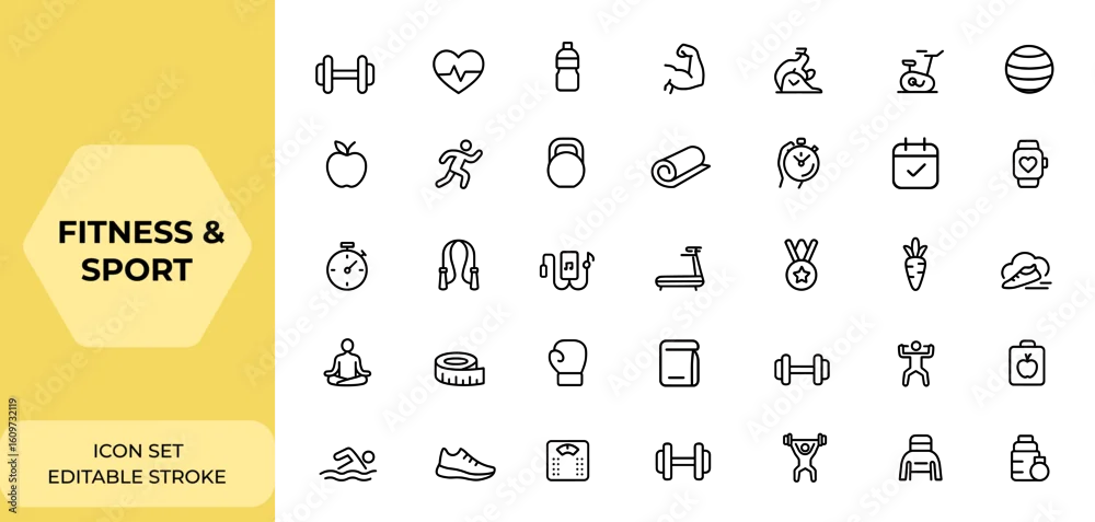 Fitness and Sport icon collection with editable stroke, thin line gym and health care icons for healthy lifestyle. Vector illustration, wellness, exercise, training, workout, active, sport
