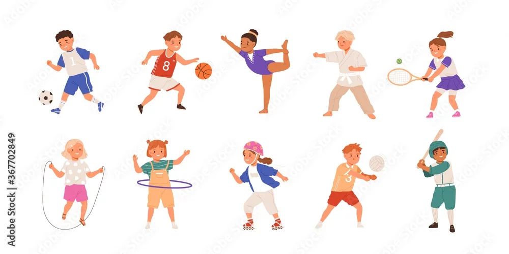 Fototapeta Happy children playing sport game, doing physical exercise. Training set. Football, baseball, tennis, karate. Active healthy childhood. Flat vector cartoon illustration isolated on white background - sportowe - Picturewall.pl