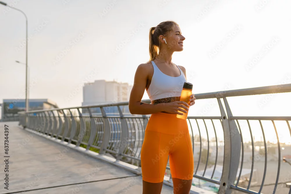 Fototapeta pretty young smiling woman doing sports in the morning in stylish sport outfit sportswear, skinny strong body, healthy fit lifestyle - sportowe - Picturewall.pl
