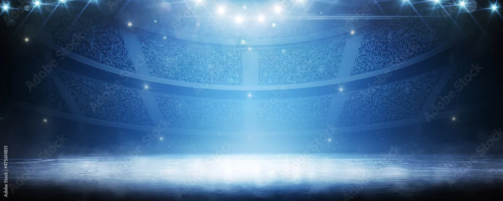 Fototapeta Sport background. Blue ice floor texture and mist. Snow and ice background. Empty ice rink illuminated by spotlights. Scene Illumination - sportowe - Picturewall.pl