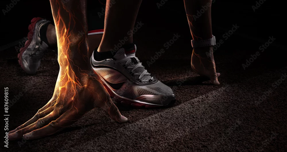 Fototapeta Sport. Runner. Hands on starting line. Power in the veins. Fire and energy - sportowe - Picturewall.pl
