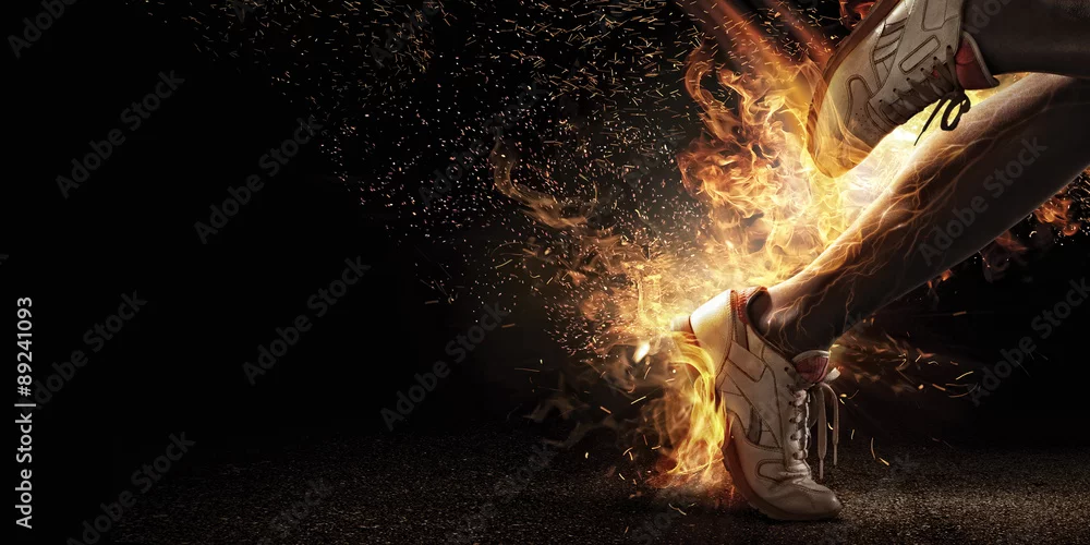 Fototapeta Sport. Runner. Side view of a jogger legs with the power in the veins isolated on black. Fire and energy - sportowe - Picturewall.pl