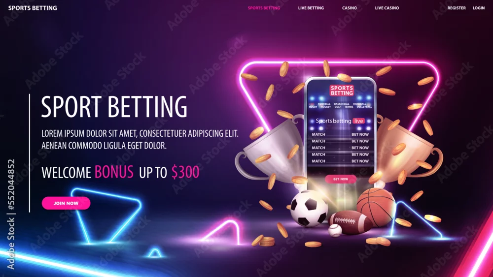 Sports betting, digital banner with smartphone, champion cups, falling gold coins and sport balls on dark scene with neon blue and pink triangles around