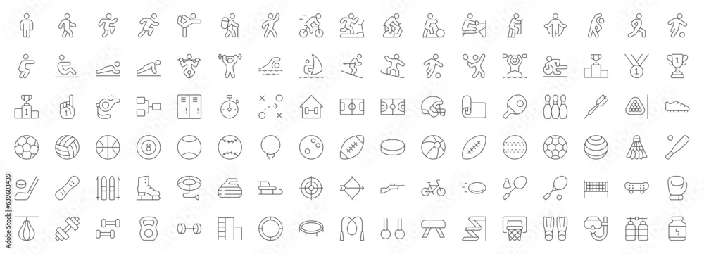 Fototapeta Sports line icons. Vector illustration include icon - swimming, bowling, golf, basketball, cloakroom, football, workout, fitness, fitball outline pictogram for healthy activity . Editable Stroke
