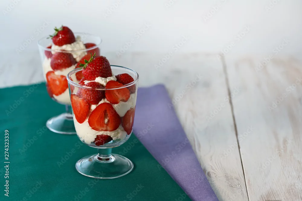 Fototapeta Bita śmietana i truskawki podawane w szklance. Purpurowe i ciemnozielone serwetki, biały drewniany stół, wysoka rozdzielczość
