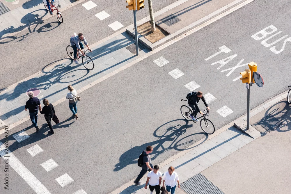 Fototapeta Ludzie przechodzący przez ulicę Kolarstwo i piesze Znak drogowy Inteligentne miasto Miejski styl życia na zewnątrz