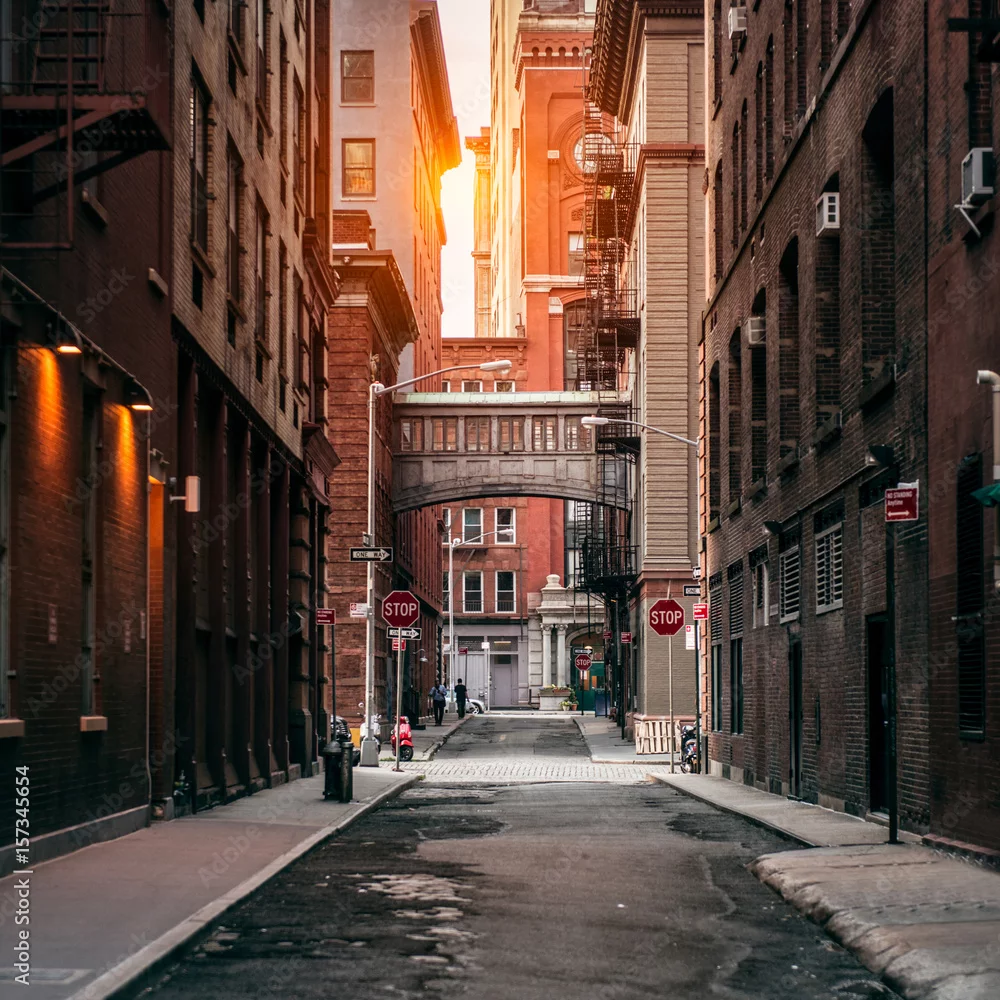 Fototapeta Miasto Nowy Jork ulica przy zmierzchu czasem. Stara malownicza ulica w dzielnicy TriBeCa na Manhattanie.
