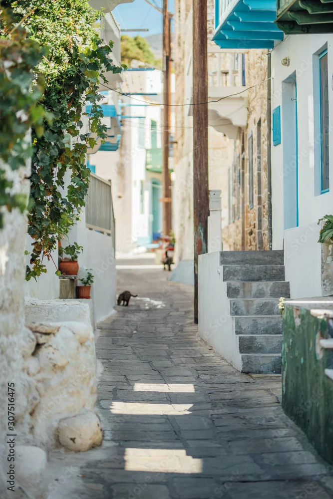 Fototapeta Wąska ulica wyłożona kamieniami z małymi domkami, schodami, balkonami, roślinami i kwiatami na wyspie Nisyros w Grecji