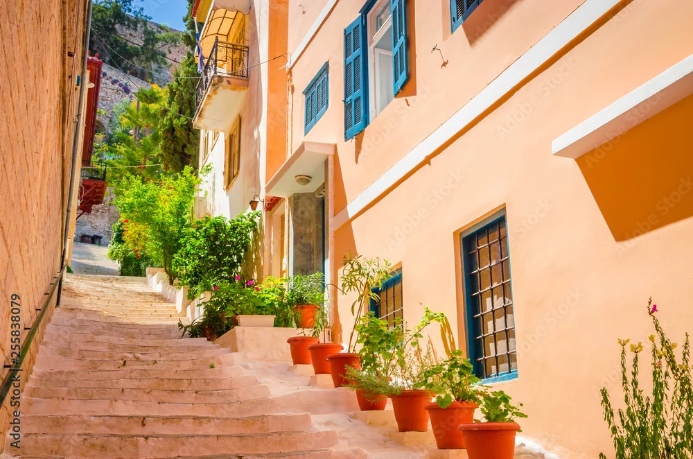 Fototapeta Traditional cozy greek street in city Nafplio, Greece