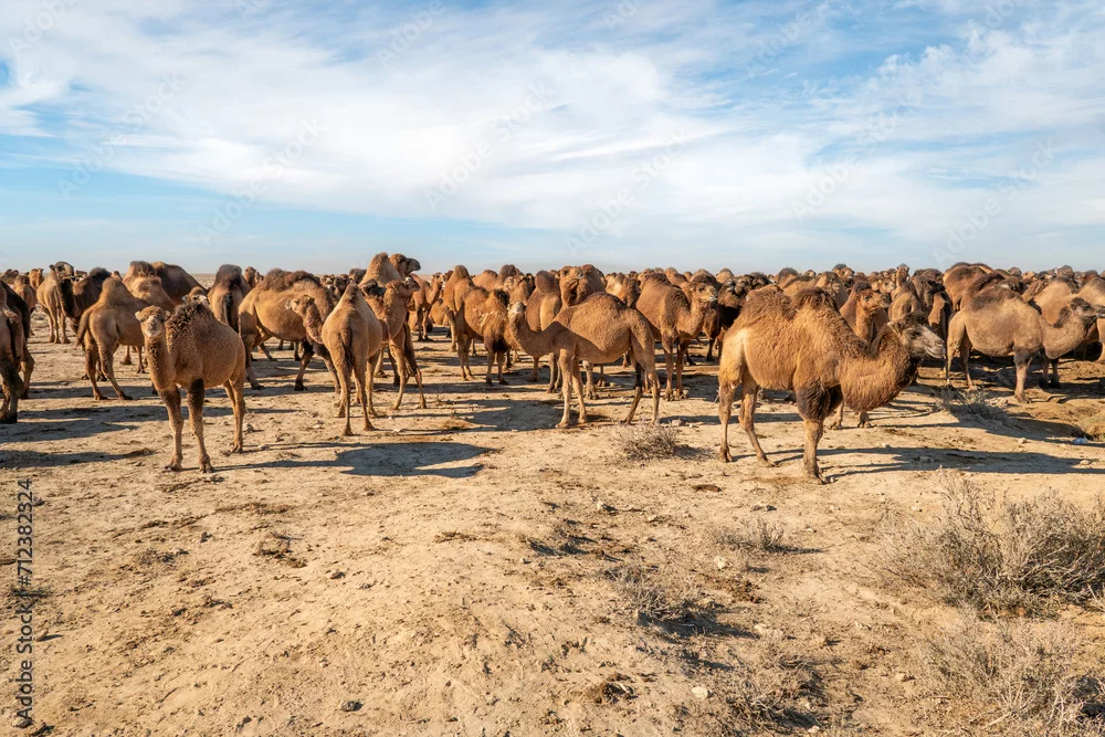 Fototapeta lots of camels to graze in nature.. Camels at Kyzylkum Desert in Uzbekistan.