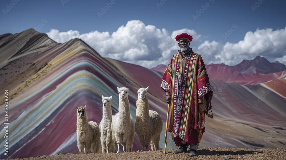 Fototapeta Rdzenny Peruwiańczyk w tradycyjnym stroju prowadzi lamy przez kolorowe Góry Tęczowe Vinicunca w Peru, pośród majestatycznych andyjskich krajobrazów.