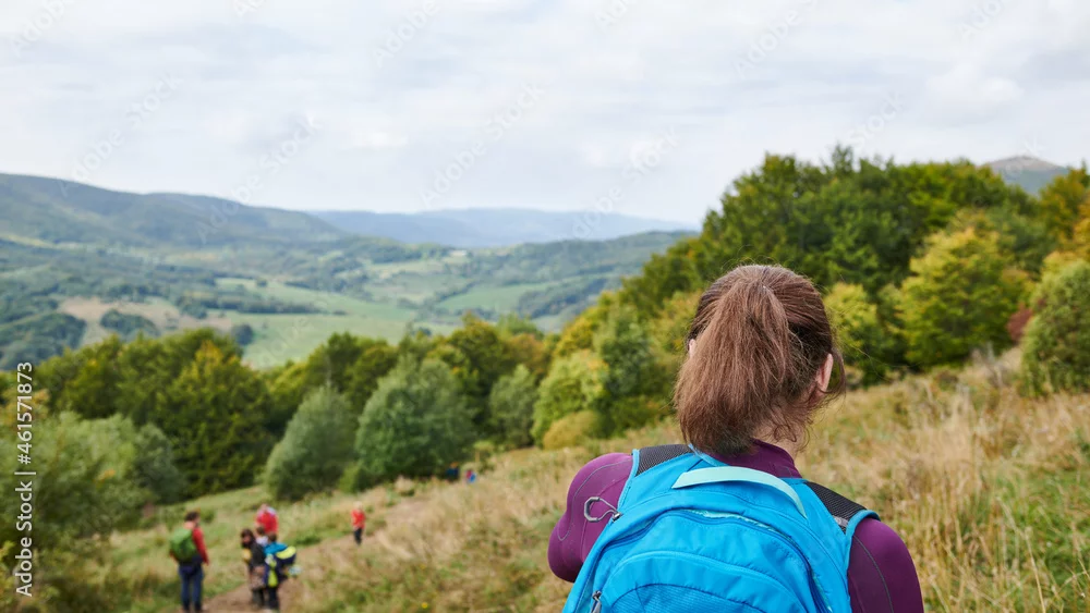 Fototapeta Jesień w Bieszczadach. Turyści na szlakach. Połoniny. Kolory jesieni. Panorama.