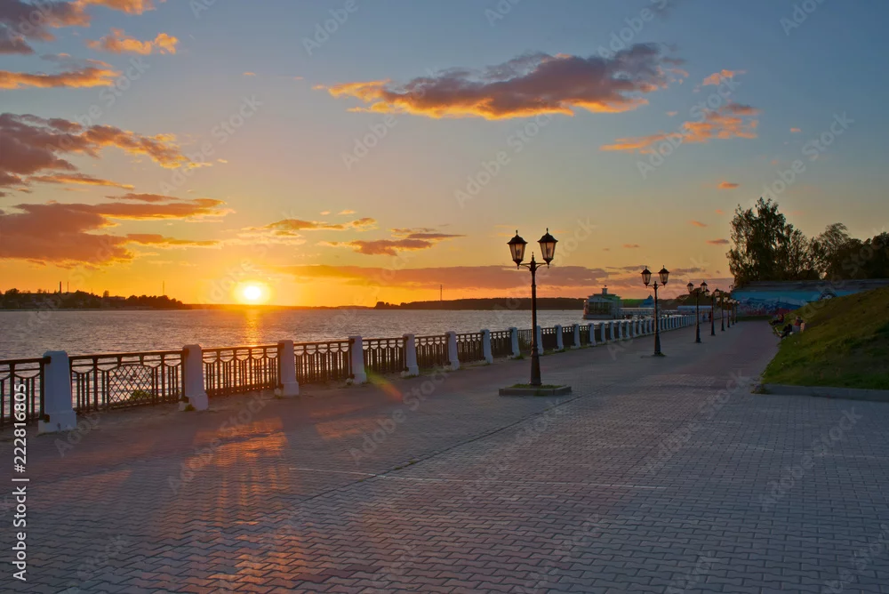 Fototapeta Widok na nabrzeże i rzekę Wołgę o zachodzie słońca. Kostroma, Rosja. - zachód słońca - Picturewall.pl