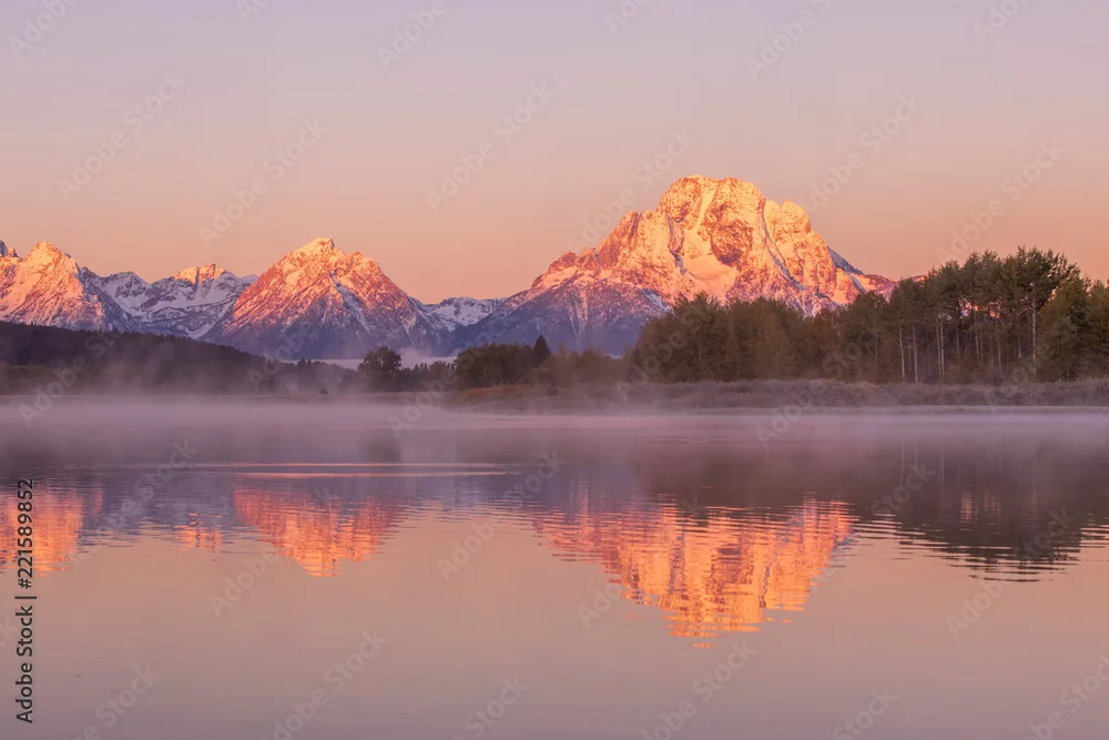Fototapeta Wschód słońca odbicie Tetons jesienią - zachód słońca - Picturewall.pl