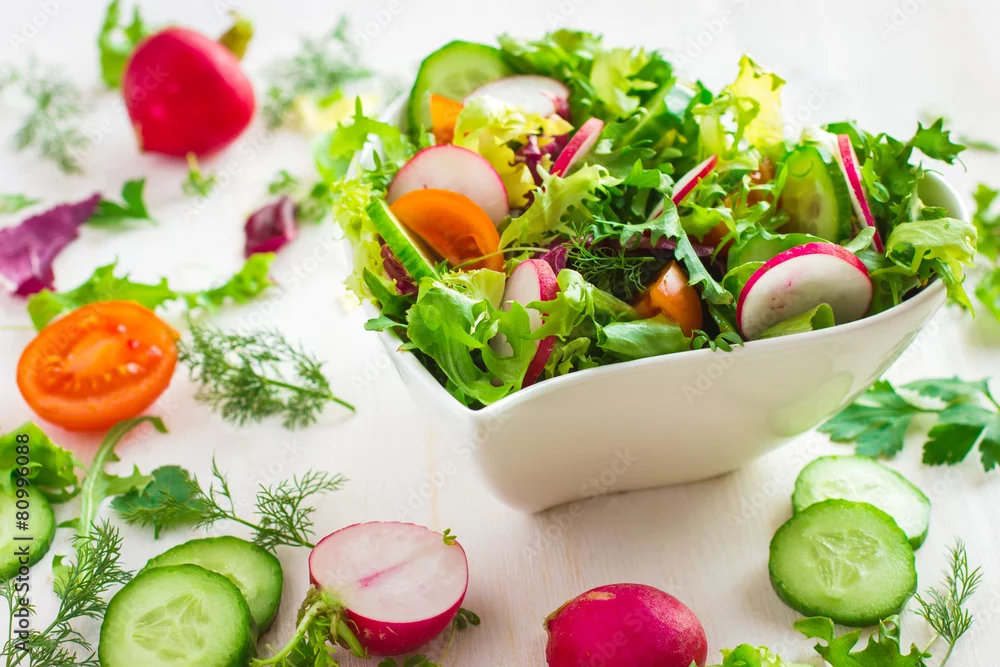 Fototapeta Zdrowa sałatka ze świeżych warzyw i składników na białym bac - Picturewall.pl