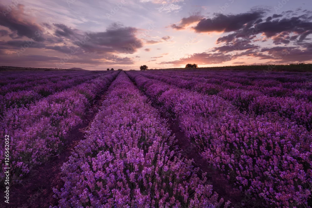 Fototapeta Zmierzch przy lawendy polem blisko Burgas miasta, Bułgaria