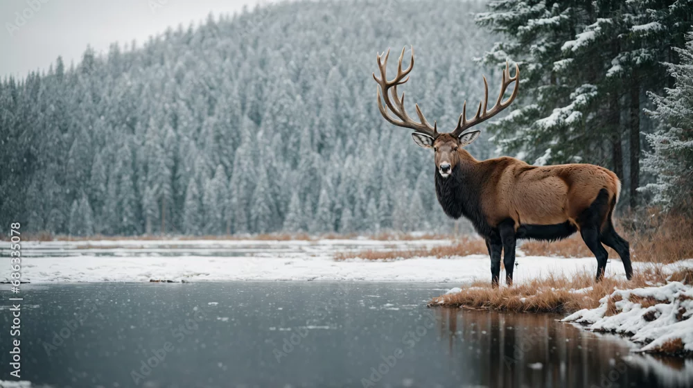 Fototapeta Jelenie w zimowym krajobrazie lasu. Generative AI.