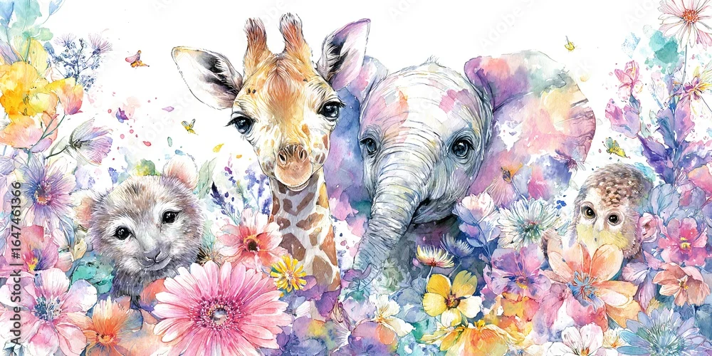Fototapeta AKWARELOWA SCENA DŻUNGLI Z UROCZYMI ZWIERZĘTAMI