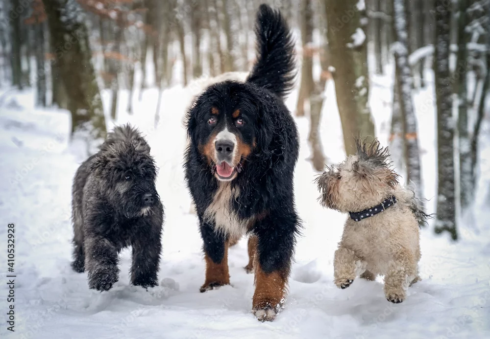 Fototapeta Bouvier des Flandres, berneński pies pasterski i lhasa apso biegną po śniegu - zwierzęta - Picturewall.pl