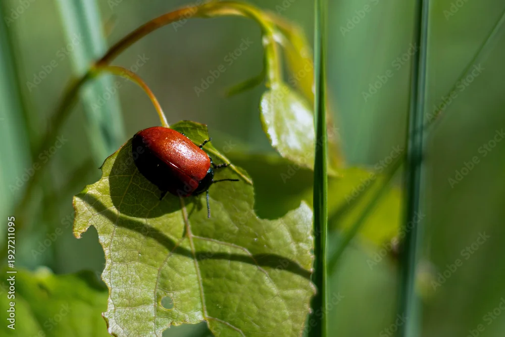 Fototapeta przyroda, zwierzęta, chrząszcz, łąka, zieleń, czerwień, łodygi, lato,wiosna,