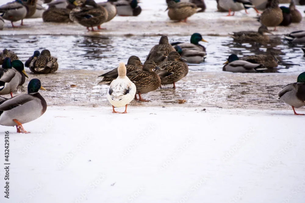 Fototapeta stado dzikich kaczek na częściowo zamarzniętym jeziorze, kaczka albinos