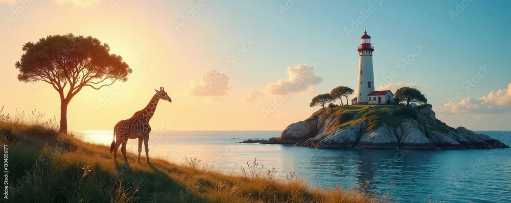 Fototapeta Lonely giraffe, small island, majestic lighthouse backdrop , isolated, peaceful