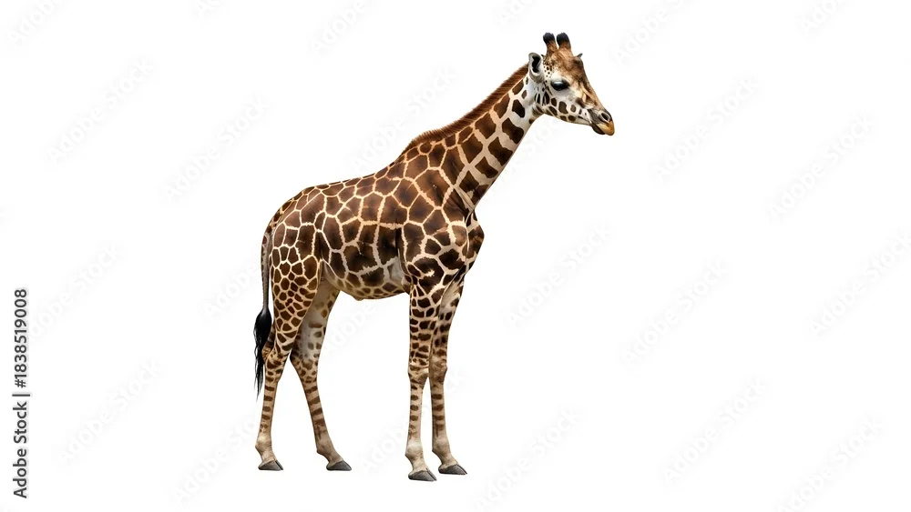 Fototapeta A magnificent giraffe standing tall and proud, showcasing its distinctive spotted coat and long neck, isolated against a pristine white background - żyrafy - Picturewall.pl
