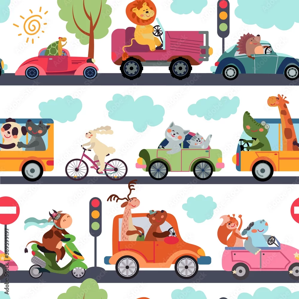 Animal transport pattern. Transportation, funny city zoo traffic. Kids fabric print cute cartoon car vector seamless texture. Pattern zoo transportation, fox and lion character adorable illustration