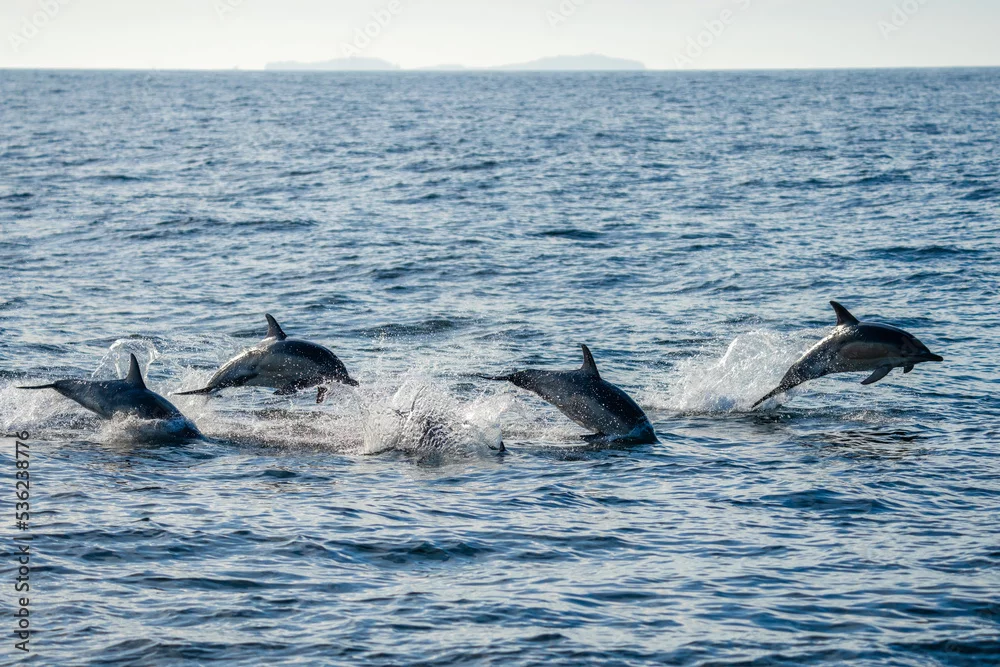 Naklejka na ścianę A pod of dolphins swimming and jumping near St Kilda in the outer Hebrides of Scotland