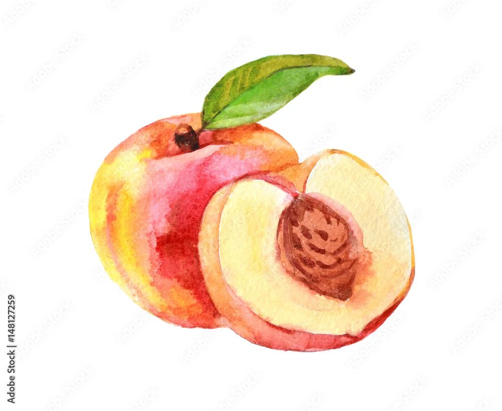 Naklejka na ścianę Brzoskwini owoc z liściem, akwareli ilustracja