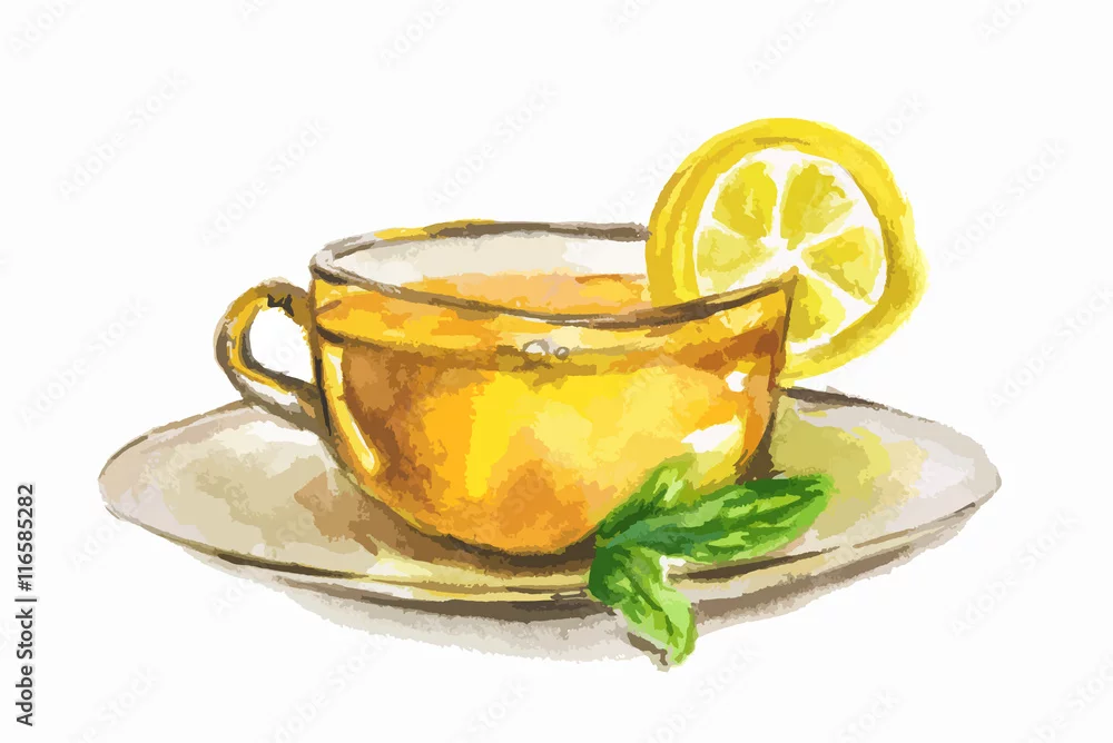 Naklejka na ścianę Filiżanka herbaty akwarela z plasterkiem cytryny i miętą. Naturalna herbata ziołowa. Angielska tradycja.